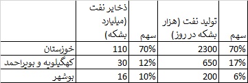 خوزستان سهمی ۷۰ درصدی، کهگیلویه و بویراحمد سهم ۱۷ درصدی و خود بوشهر سهمی ۶ درصدی در تولید نفت خام کشور دارند.